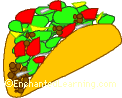 A taco is a Mexican food that consist of a folded, fried tortilla that contains a mixture of food, usually beans, meat, cheese, lettuce and tomatoes.