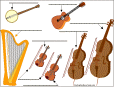 String instruments are musical instruments that are played by plucking, strumming, picking, or bowing the strings. The guitar, violin, viola, cello, double bass, ukulele, lute, harp, and banjo are stringed instrument.