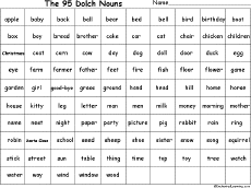 95 Dolch Nouns Print a chart of the 95 Dolch nouns. You can use this chart to check off the words you know or to review the nouns. Words: apple, baby, back, ball, bear, bed, bell, bird, birthday, boat, box, boy, bread, brother, cake, car, cat, chair, chicken, children, Christmas, coat, corn, cow, day, dog, doll, door, duck, egg, eye, farm, farmer, father, feet, fire, fish, floor, flower, game, garden, girl, good-bye, grass, ground, hand, head, hill, home, horse, house, kitty, leg, letter, man, men, milk, money, morning, mother, name, nest, night, paper, party, picture, pig, rabbit, rain, ring, robin, Santa Claus, school, seed, sheep, shoe, sister, snow, song, squirrel, stick, street, sun, table, thing, time, top, toy, tree, watch, water, way, wind, window, wood. |