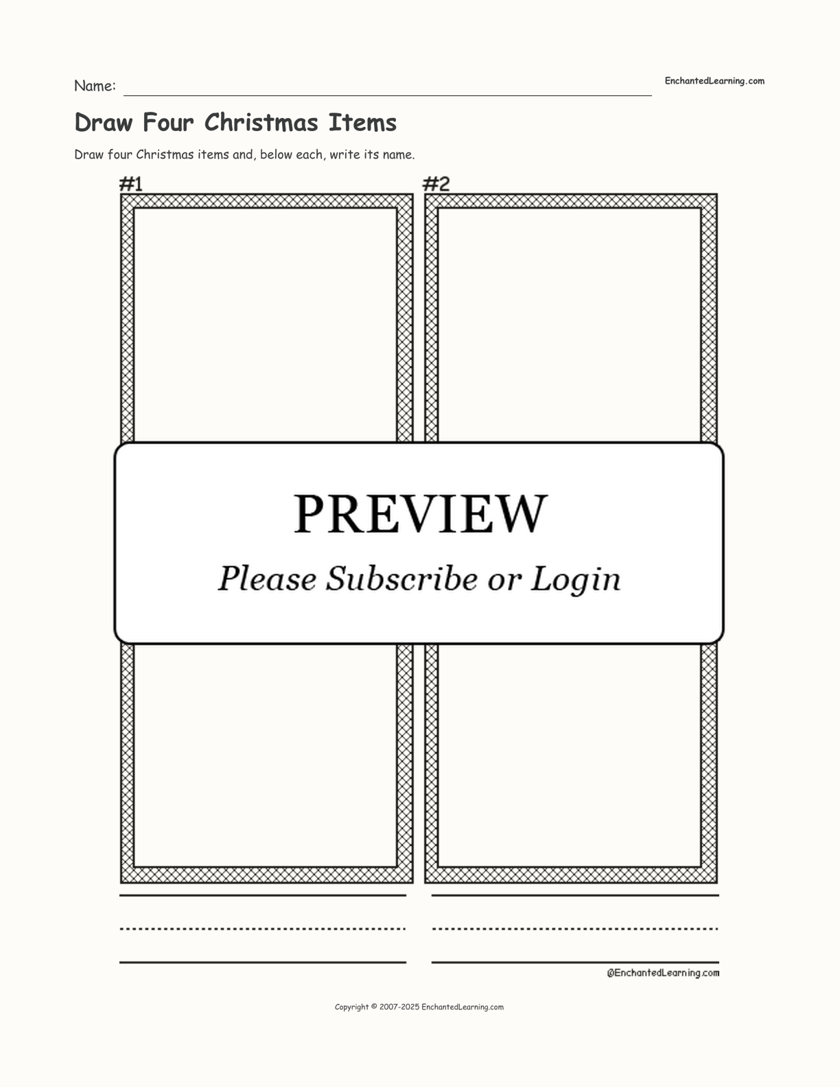 On this printable worksheet for early readers, draw four Christmas items, then write the name of each item under its picture.