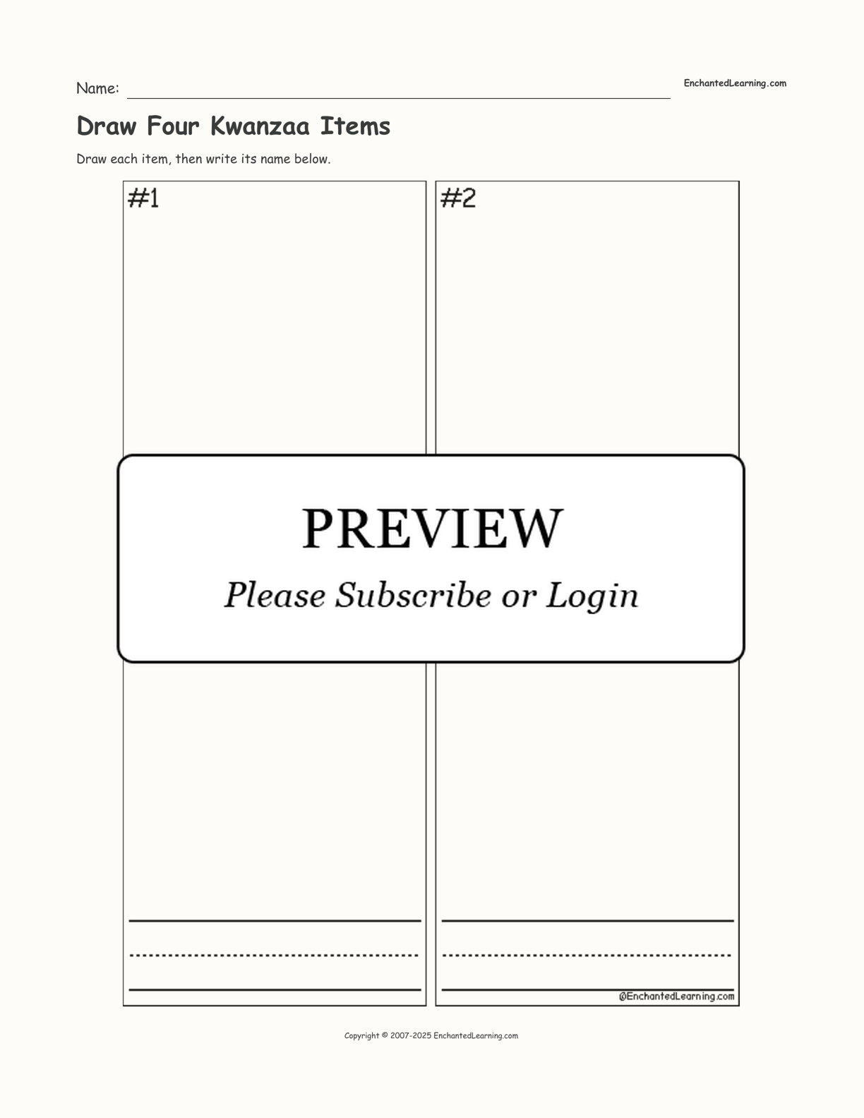 Draw four Kwanzaa items in this printout on drawing and writing, for early readers. Below each item, write its name.