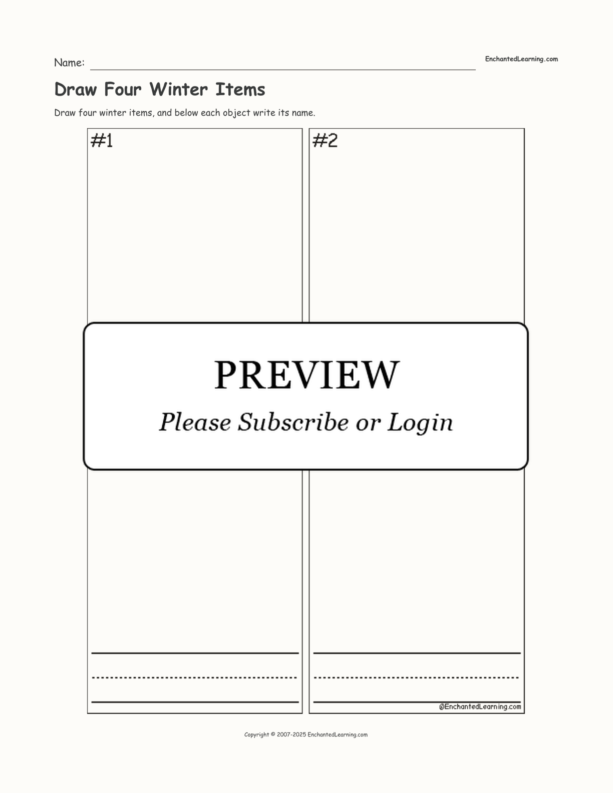Draw four winter items in this printable worksheet. Below each object, write its name.