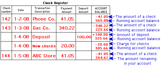 Each time you write a check, you should also write an entry in your checkbook register, noting everything about the check, including the check number, the date, who the check was written to, and the amount of the check. After you do this, you can calculate how much money you have left in your account (this is called your account balance).