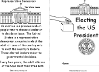 A short, printable book about how the US President is elected. Page headings include: Representative Democracy, Issues You Care About, Political Parties, Primary Elections, Political Conventions, Registering to Vote, How to Vote, Who Wins? (the Electoral College), and The Presidential Term.
