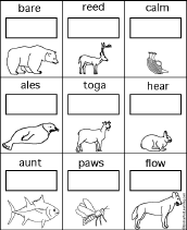 Match the Animal Anagrams #1 Draw a line from each animal word to its anagram. Words: owl/low, slug/lugs, hogs/gosh, ape/pea, bats/tabs, egret/greet, clam/calm, goat/toga, smelt/melts, tuna/aunt. Or go to the answers. |