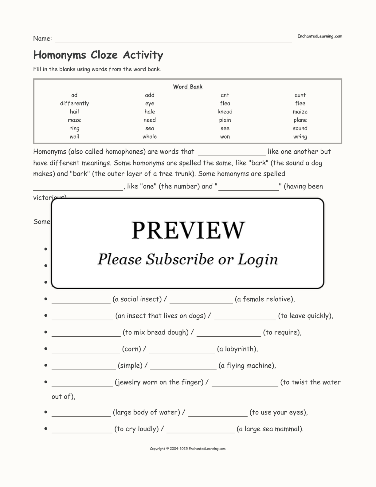 ad, add, ant, aunt, differently, eye, flea, flee, hail, hale, knead, maize, maze, need, plain, plane, ring, sea, see, sound, wail, whale, won, wring
