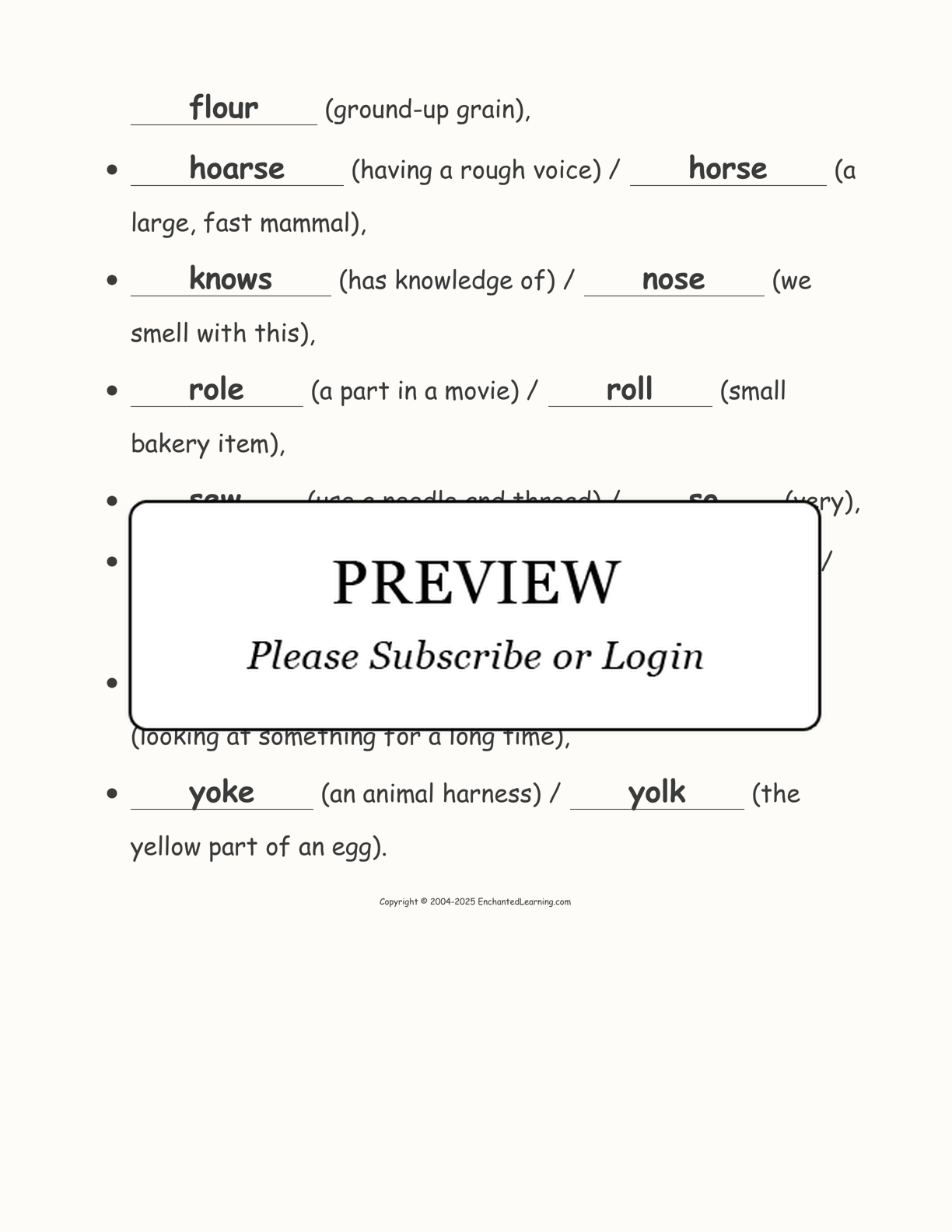 be, flour, flower, hair, hoarse, horse, knows, meanings, night, nose, role, roll, sew, so, stairs, stares, there, they’re, trunk, two, words, yoke, yolk