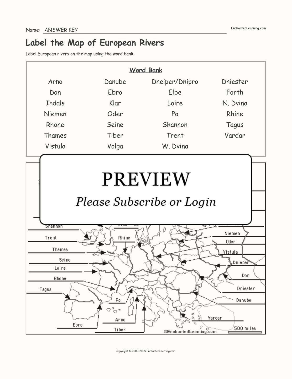 Arno, Danube, Dneiper/Dnipro, Dniester, Don, Ebro, Elbe, Forth, Indals, Klar, Loire, N. Dvina, Niemen, Oder, Po, Rhine, Rhone, Seine, Shannon, Tagus, Thames, Tiber, Trent, Vardar, Vistula, Volga, W. Dvina