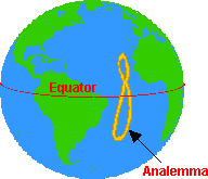 The analemma is a figure-8-shaped diagram that shows the declination of the sun (the angle that the sun is from the equator), for each day in the year. If you took a snapshot of the sun at the same time each day (from the same location), the Sun would make a figure shaped like an analemma during the course of a year (this is because the Earth is tilted on its axis and because it doesn’t orbit the Sun in a perfect circle).