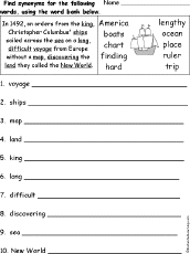 Use the word bank to find synonyms of common words. Words: voyage/trip, ships/boats, map/chart, land/place, king/ruler, long/lengthy, difficult/hard, discovering/finding, sea/ocean, New World/America. Or go to the answers.