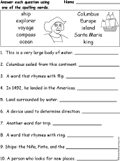Use the list of spelling words to answer simple questions. Words: ship, explorer, voyage, compass, ocean, Columbus, Europe, island, Santa Maria, king. Or go to the answers.