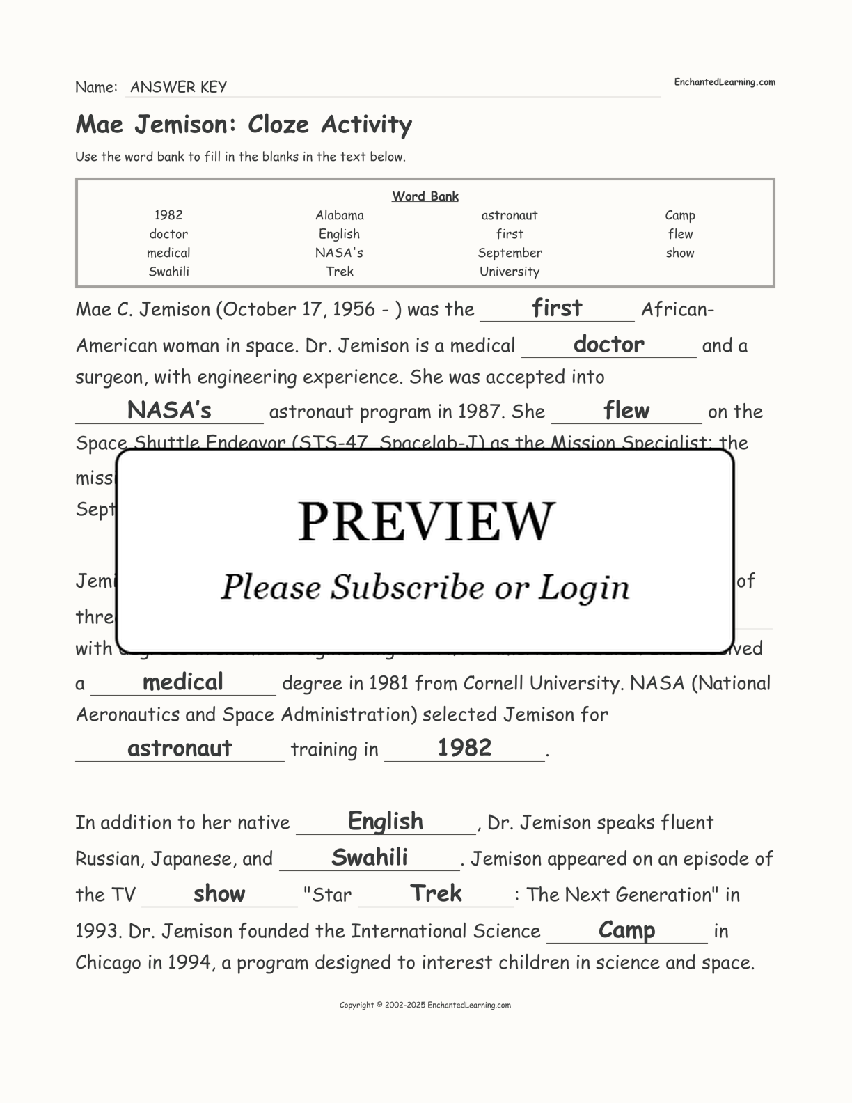 Use the word bank to fill in the blanks in this Mae Jemison cloze activity. This is a printable worksheet.