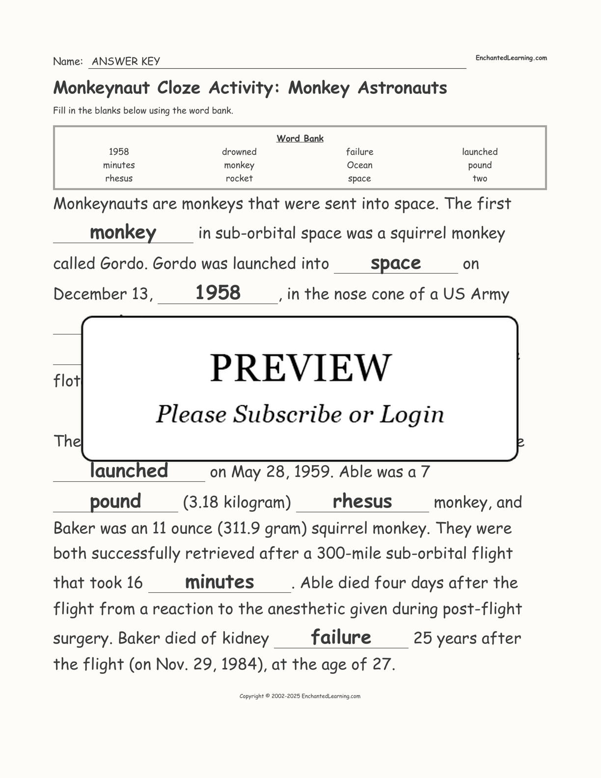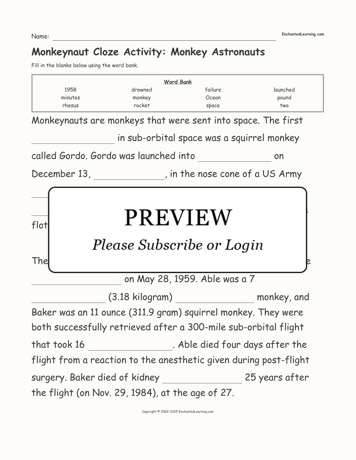 Use the word bank to fill in the blanks in this Monkeynaut cloze activity. This is a printable worksheet.