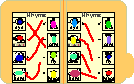 | Cut 8 pieces of yarn or string - each piece should be about 10 inches long. Hot glue one end of a piece of yarn to each picture on the left of page one and page two (glue each piece of yarn to the tiny Y in a circle by the left-hand pictures). |