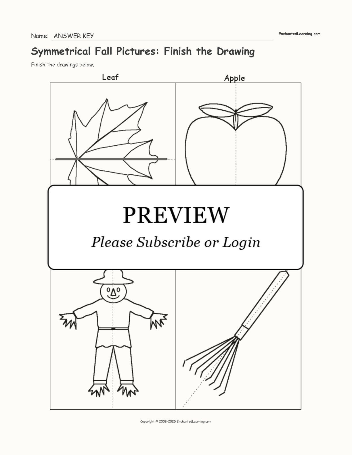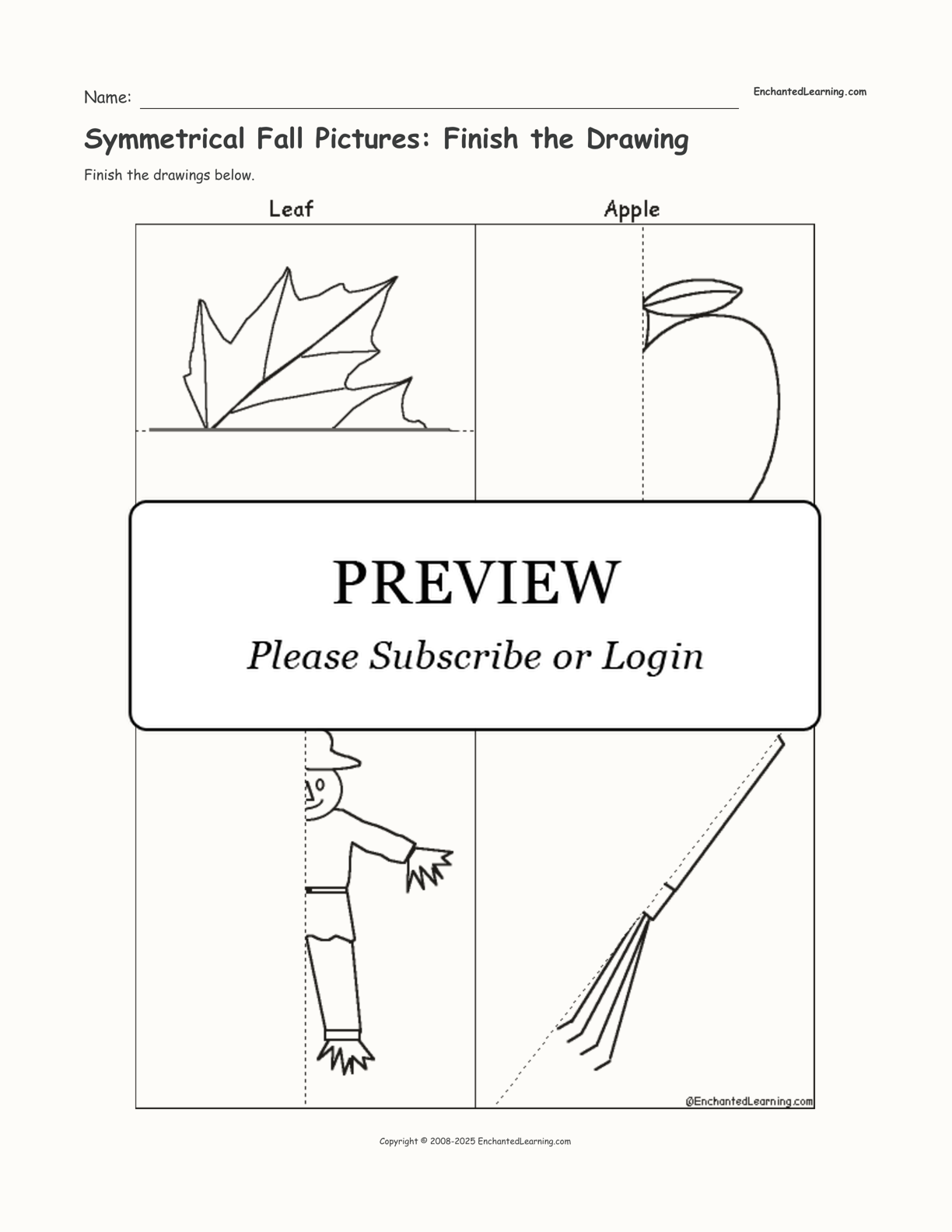 ‘Symmetrical Fall Pictures: Finish the Drawing’. Finish each of the four drawings around the line of symmetry. Fall Pictures: leaf, apple, scarecrow, and rake.