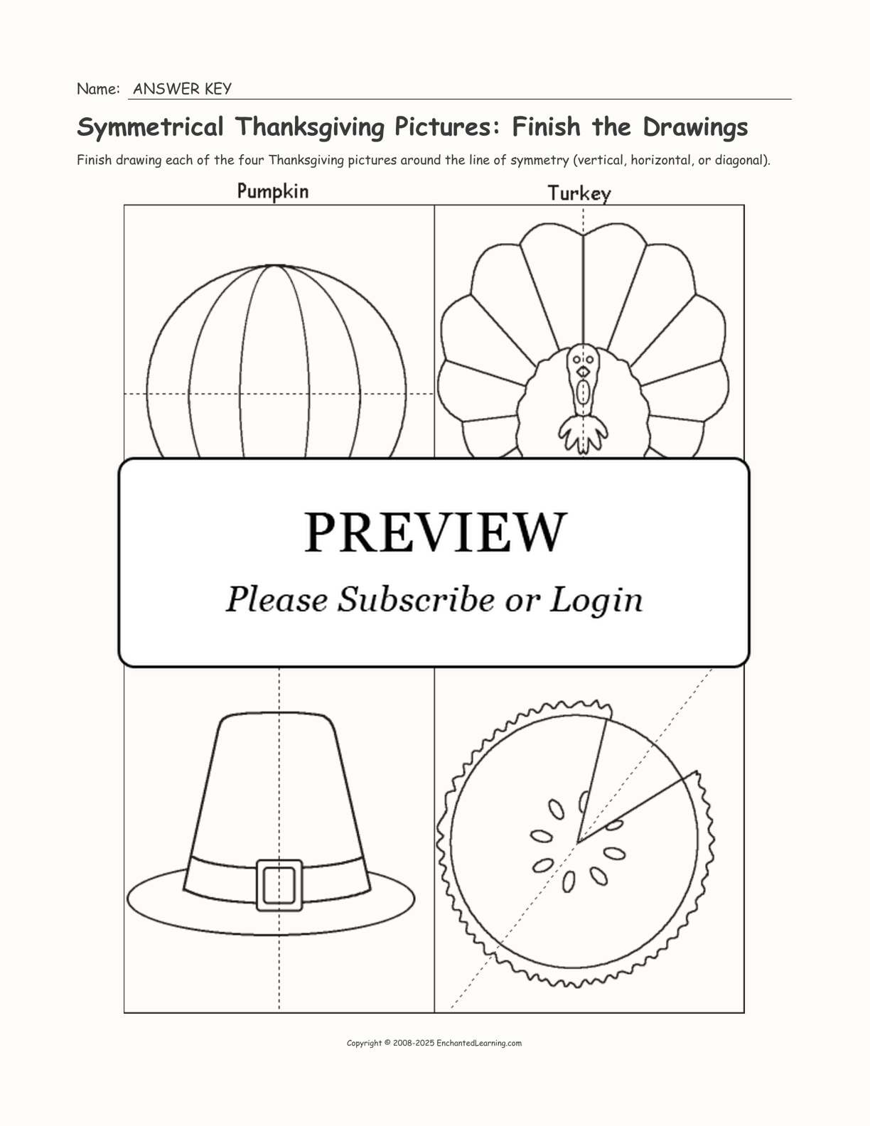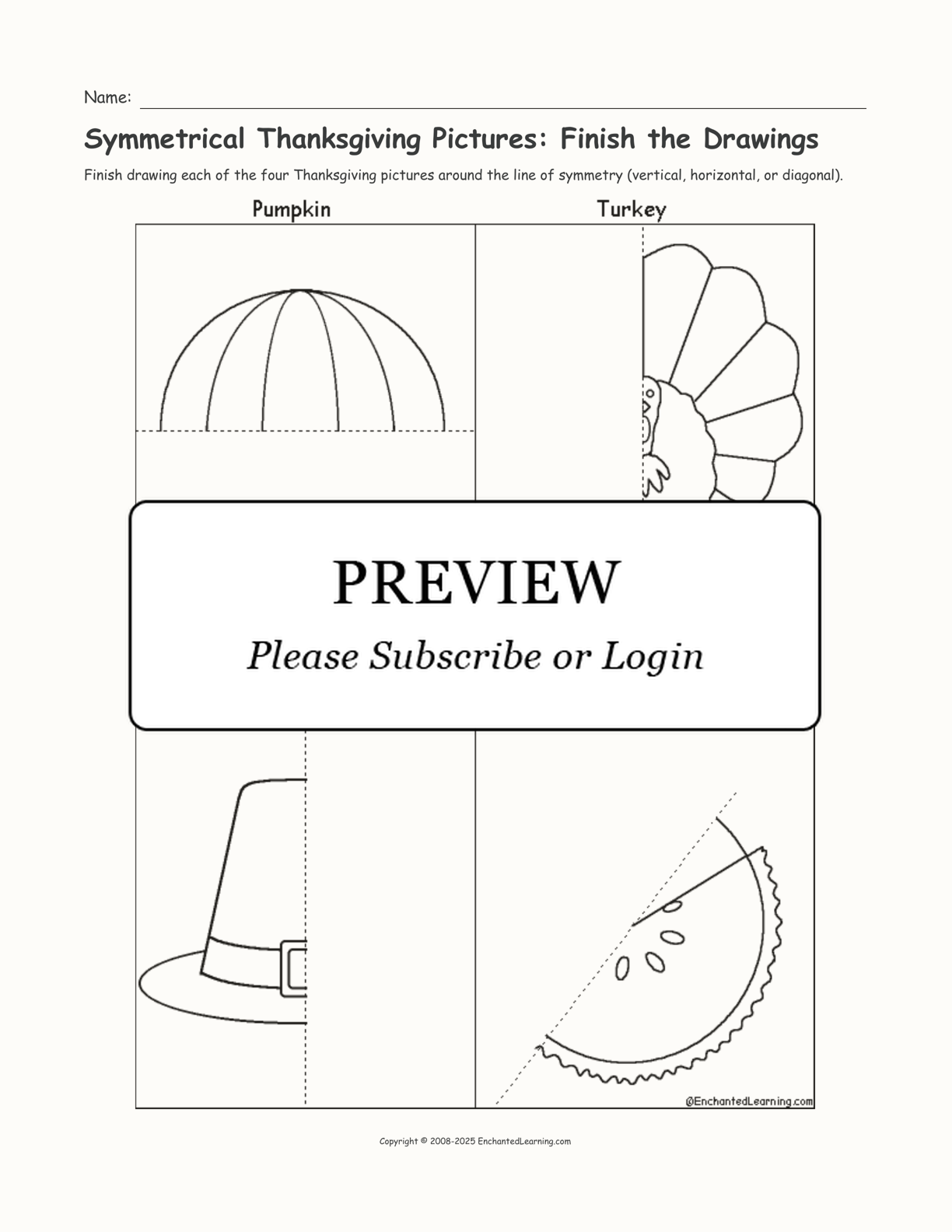 In this printable worksheet, finish drawing each of the four Thanksgiving pictures around their lines of symmetry (vertical, horizontal, or diagonal).