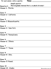 US States #1: Write a Question for Each Answer In this worksheet, the student is given a series of short answers using US states. For each answer, the student writes a short question. Answers: Florida, California, Massachusetts, New York, Pennsylvania, Illinois, Texas, Ohio, Hawaii, Alaska. |