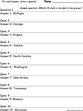 US States #2: Write a Question for Each Answer In this worksheet, the student is given a series of short answers using US states. For each answer, the student writes a short question. Answers: Michigan, Georgia, Virginia, Indiana, North Carolina, Washington, New Jersey, Tennessee, Missouri, Wisconsin. |