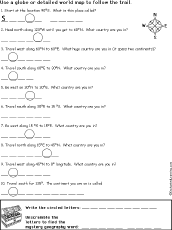 This is a thumbnail of the "Global Treasure Hunt #2 - Printable Geography Activity" page. This activity requires a globe or detailed world map (one showing country names, latitude and longitude). Then follow the directions to travel to the final geography destination. When you are done, unscramble the circled letters to find the hidden treasure.