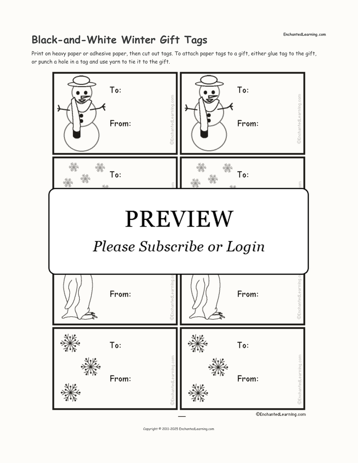 These are printable black-and-white Winter gift tags, featuring pictures of snowmen, sleds, penguins, and snowflakes.