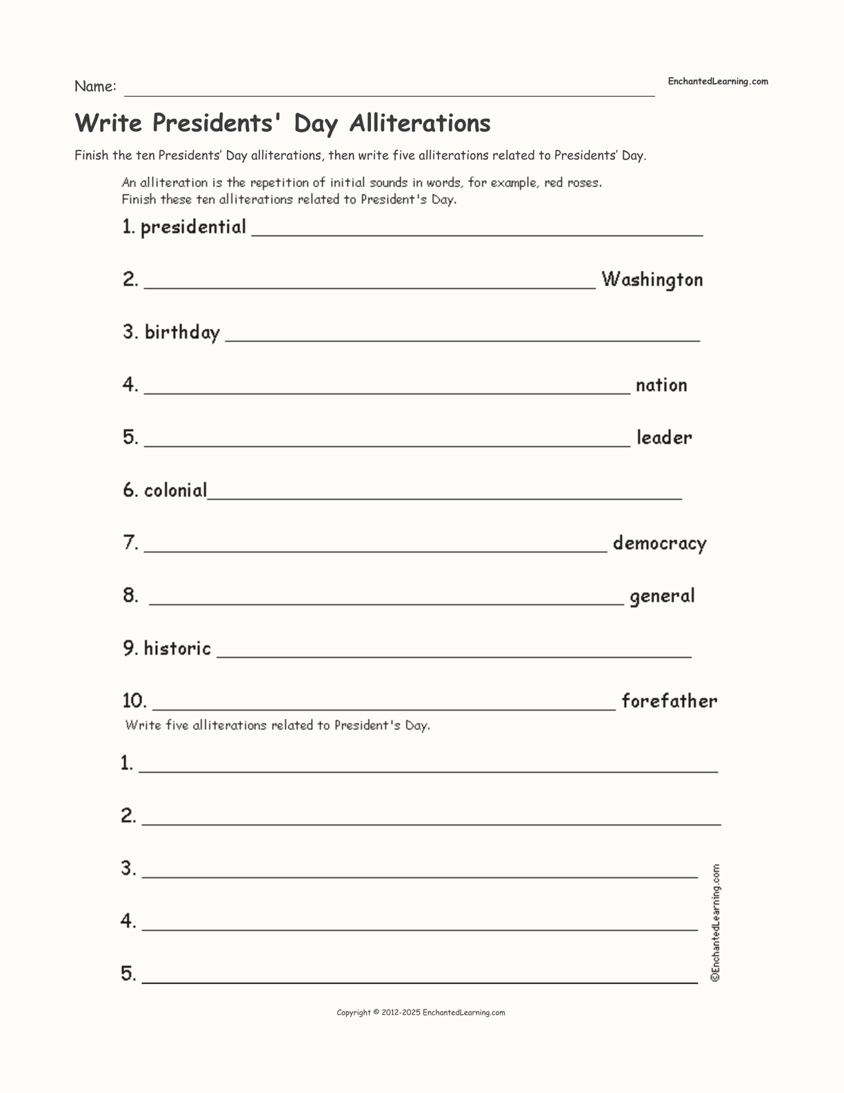 On this printable worksheet, finish the ten Presidents' Day alliterations, then write five alliterations.