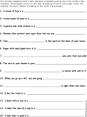 In this printable worksheet, fill in a compound word to finish the sentence. The missing compound word in each sentence is formed by using two of the words in the sentence.