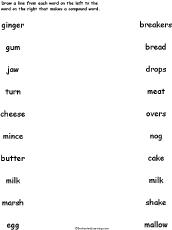 Match the Components of Dessert Compound Words Draw a line from the word of the left to the word on the right that make a sweet-food-related compound word. Words: gingerbread, gumbrops, jawbreakers, turnovers, chesecake, mincemeat, buttermilk, milkshake, marshmallow, eggnog. Or go to the answers. Or go to a pdf of the worksheet and answers. |