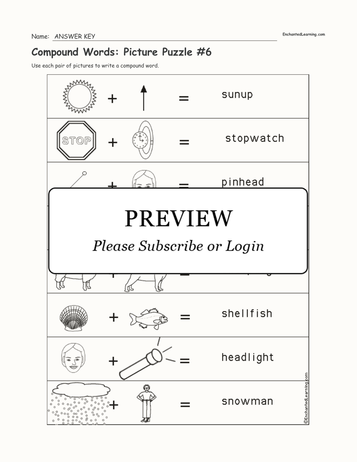 In this ‘Compound Words: Picture Puzzle #6’ worksheet, use each pair of pictures to write a compound word. Words: sunup, stopwatch, pinhead, horsefly, sheepdog, shellfish, headlight, and snowman.