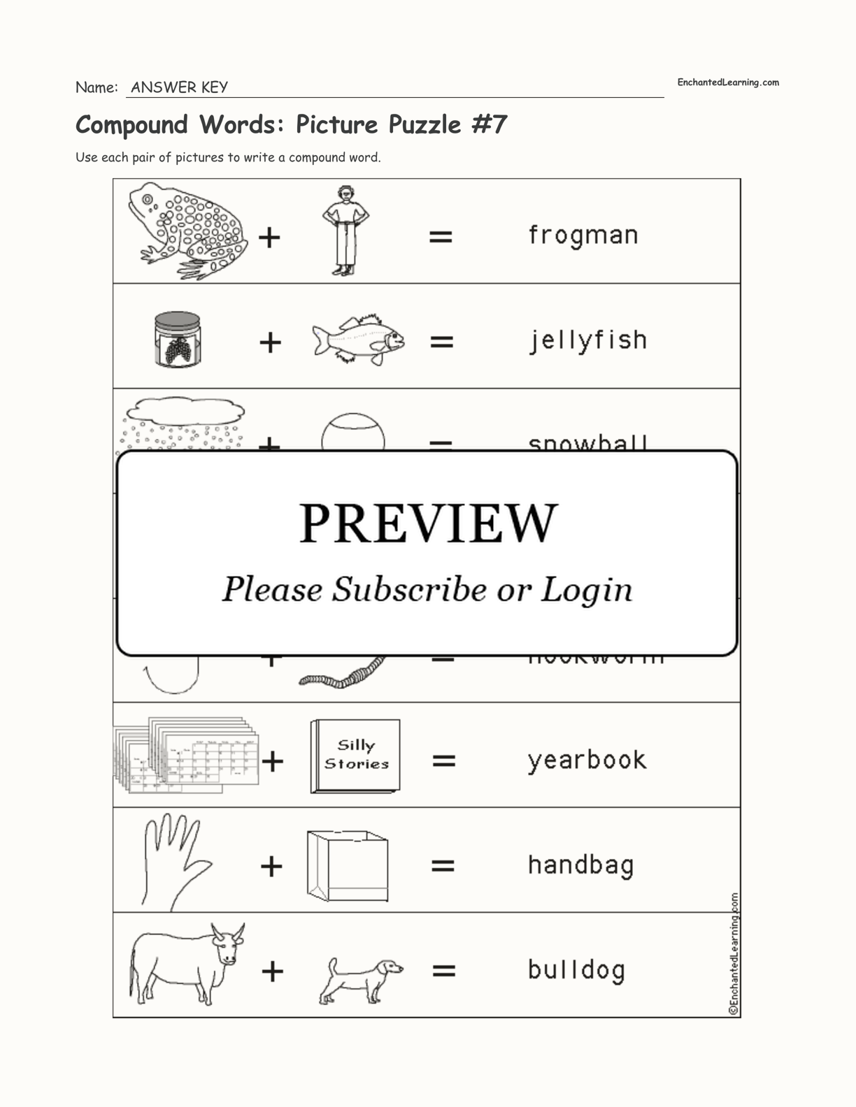 In this ‘Compound Words: Picture Puzzle #7’ worksheet, use each pair of pictures to write a compound word. Words: frogman, jellyfish, snowball, roundup, hookworm, yearbook, handbag, and bulldog.