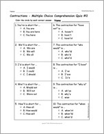 A multiple choice comprehension printable quiz about Contractions for early readers. Words: I’ll, we’re, you’d, don’t, isn’t, it’s, you’re, she’d, they’re, won’t.