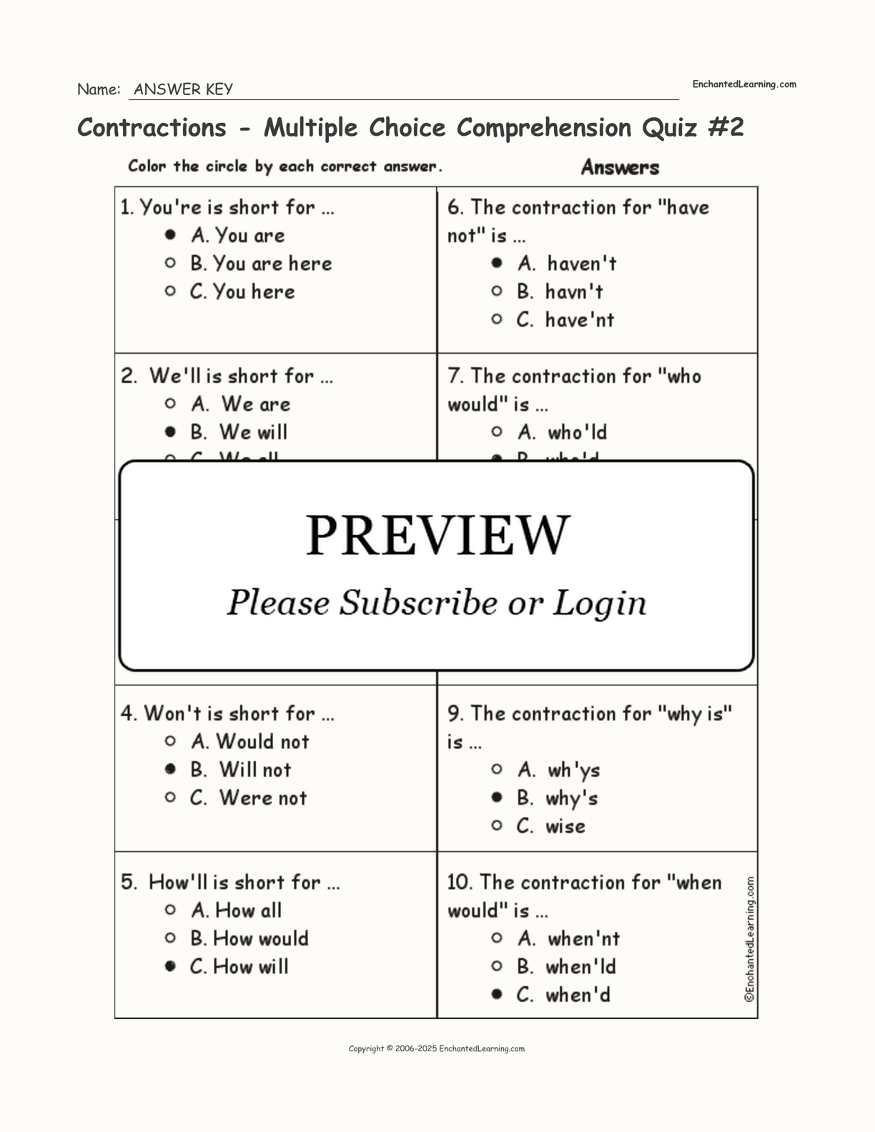 A multiple choice worksheet about Contractions for early readers. Words: you're, we'll, I'd, won't, how'll, haven't, who'd, I've, why's, when'd.