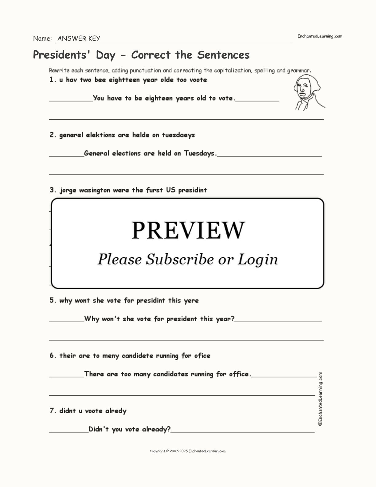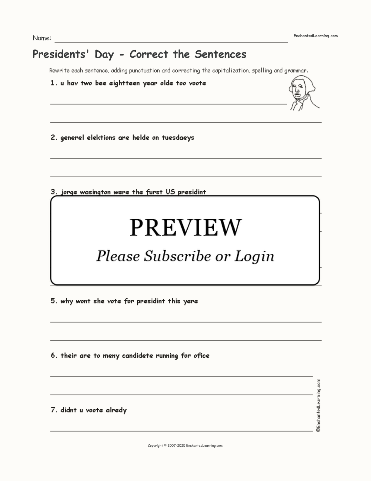 For this Presidents' Day Correct the Sentences printout, rewrite each sentence by adding punctuation and correcting the capitalization, spelling, and grammar.