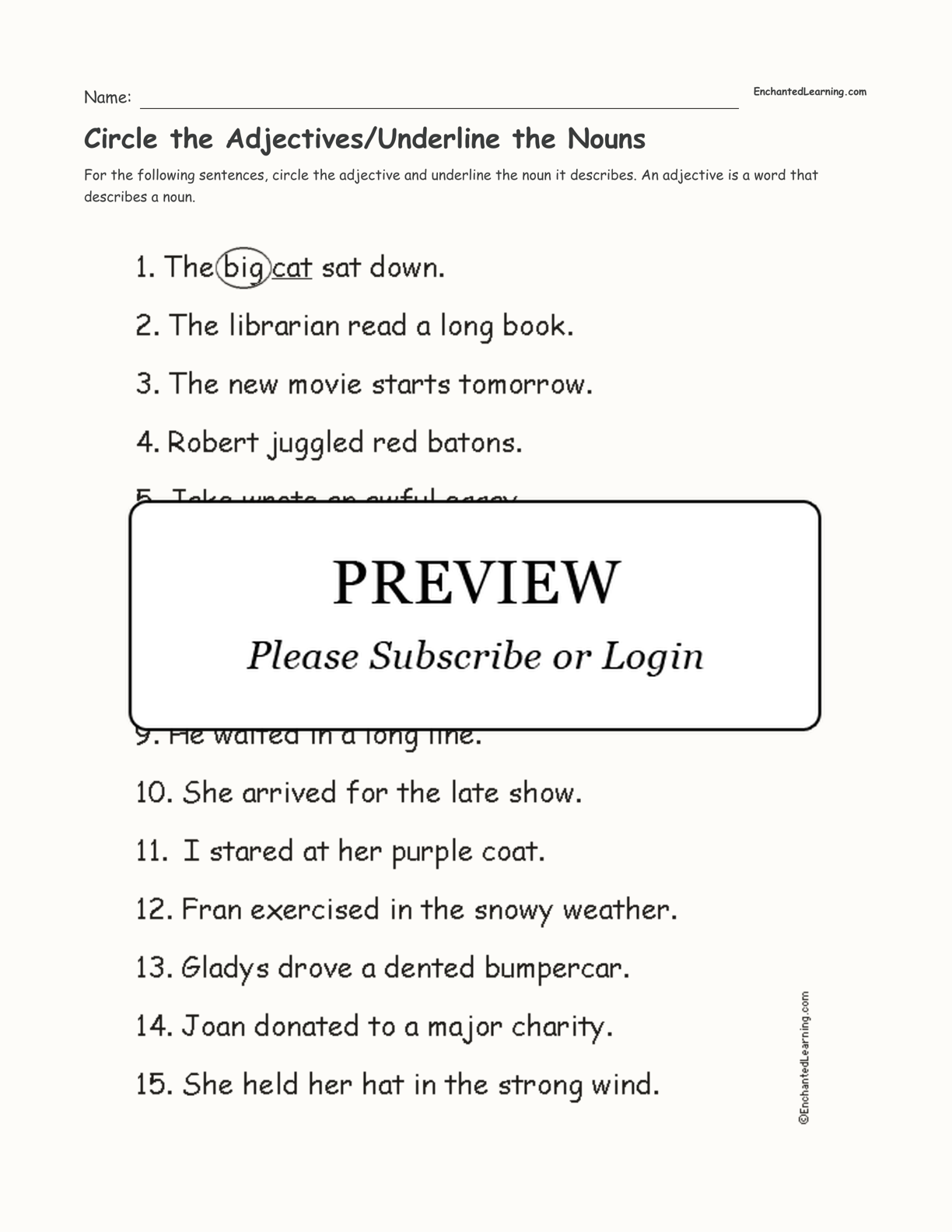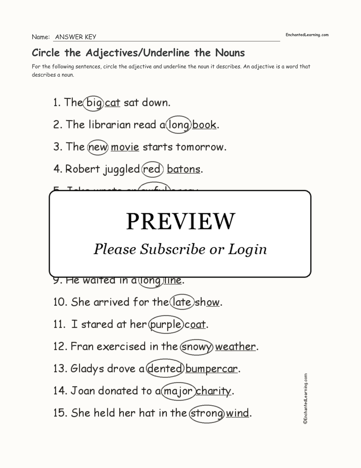 Circle the adjectives and underline the nouns they describe in this printable worksheet.