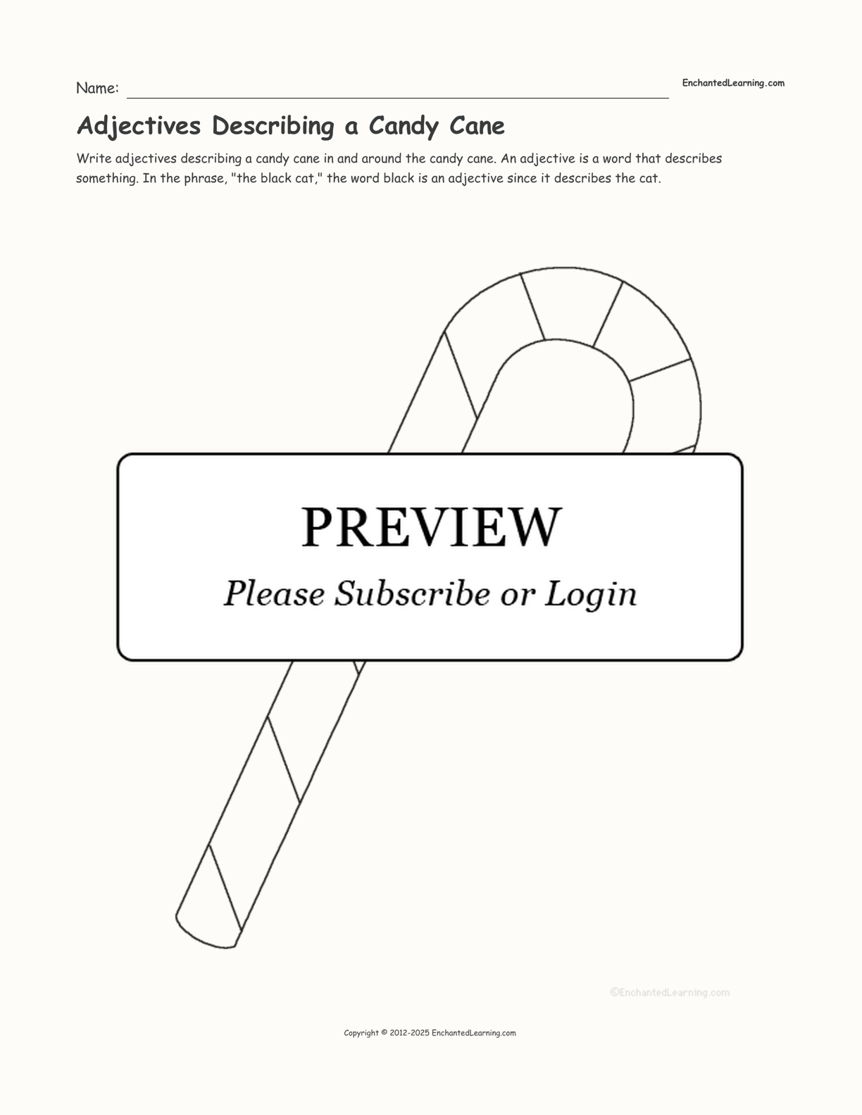 Write adjectives describing a candy cane in and around the candy cane. An adjective is a word that describes something. In the phrase, “the black cat,” the word black is an adjective since it describes the cat.
