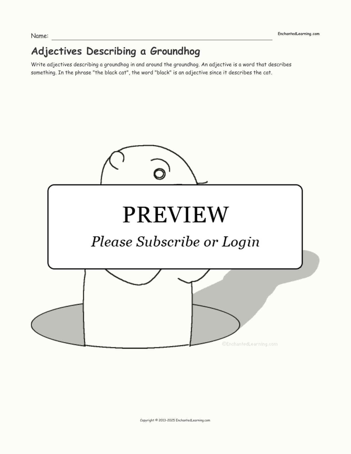 Write adjectives describing a groundhog in and around the groundhog. An adjective is a word that describes something. In the phrase “the black cat”, the word “black” is an adjective since it describes the cat.