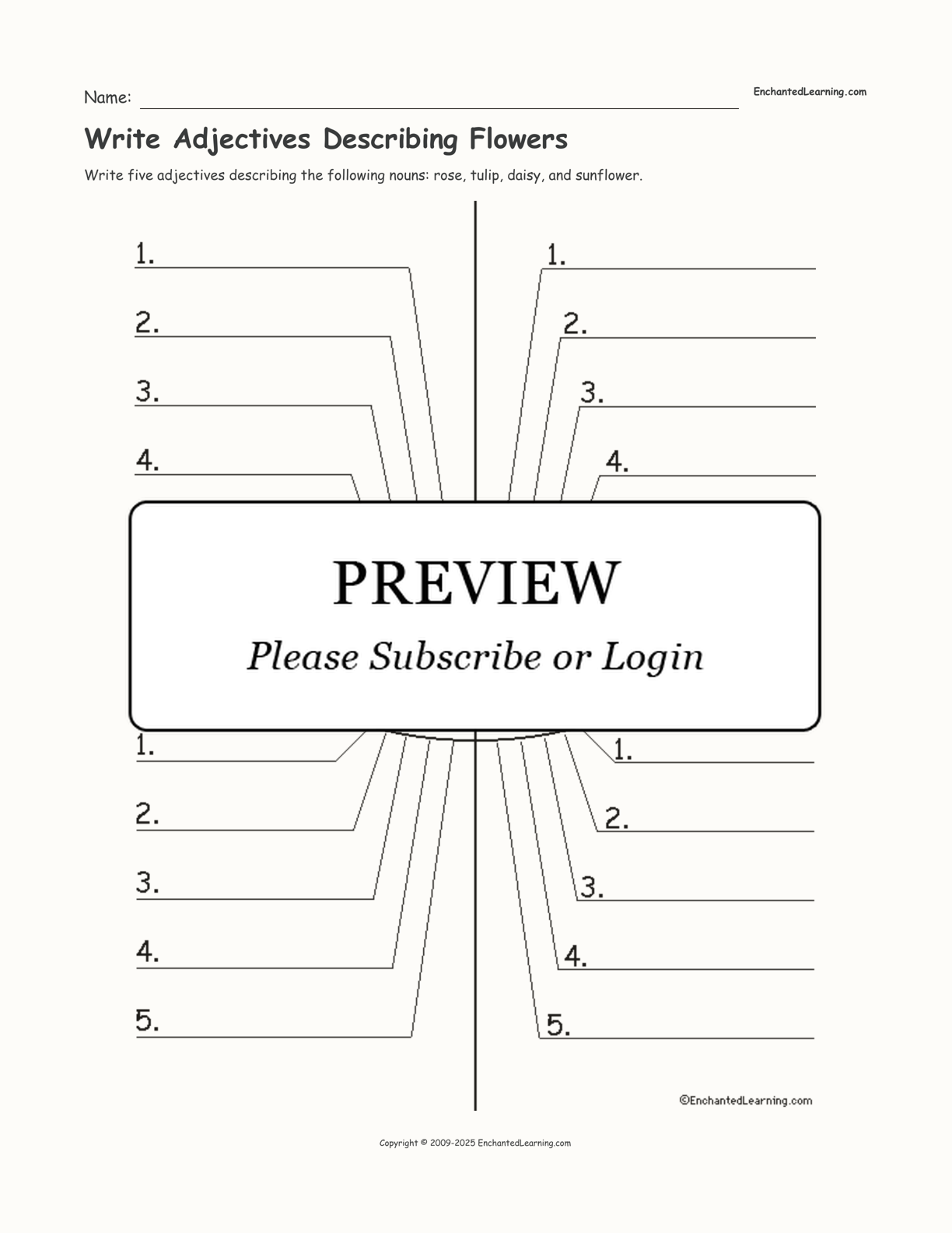 Write five adjectives describing each of the following flowers: rose, tulip, daisy, and sunflower.