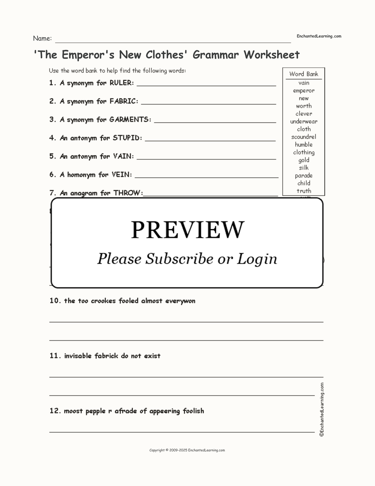 Fill out this grammar potpourri printable worksheet for ‘The Emperor’s New Clothes’ words. Find synonyms, antonyms, anagrams, and homonyms, then capitalize, punctuate, and correct the spelling of sentences.