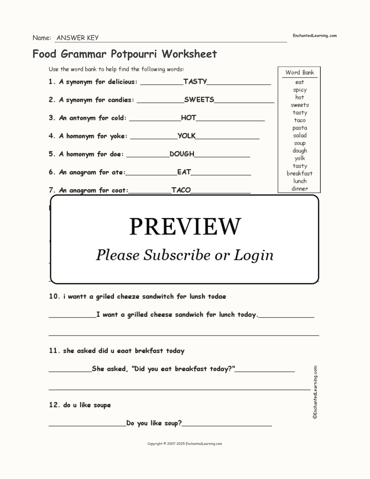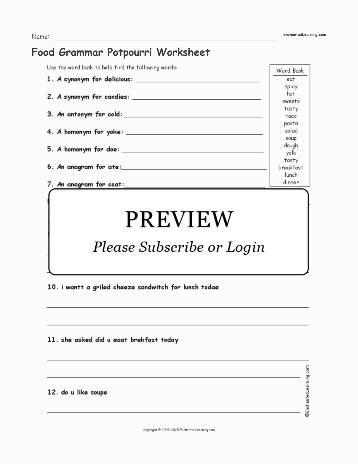 Fill out this grammar potpourri printable worksheet for food words. Find synonyms, antonym, homonyms, anagram, and a compound word, then capitalize, punctuate, and correct the spelling of sentences.