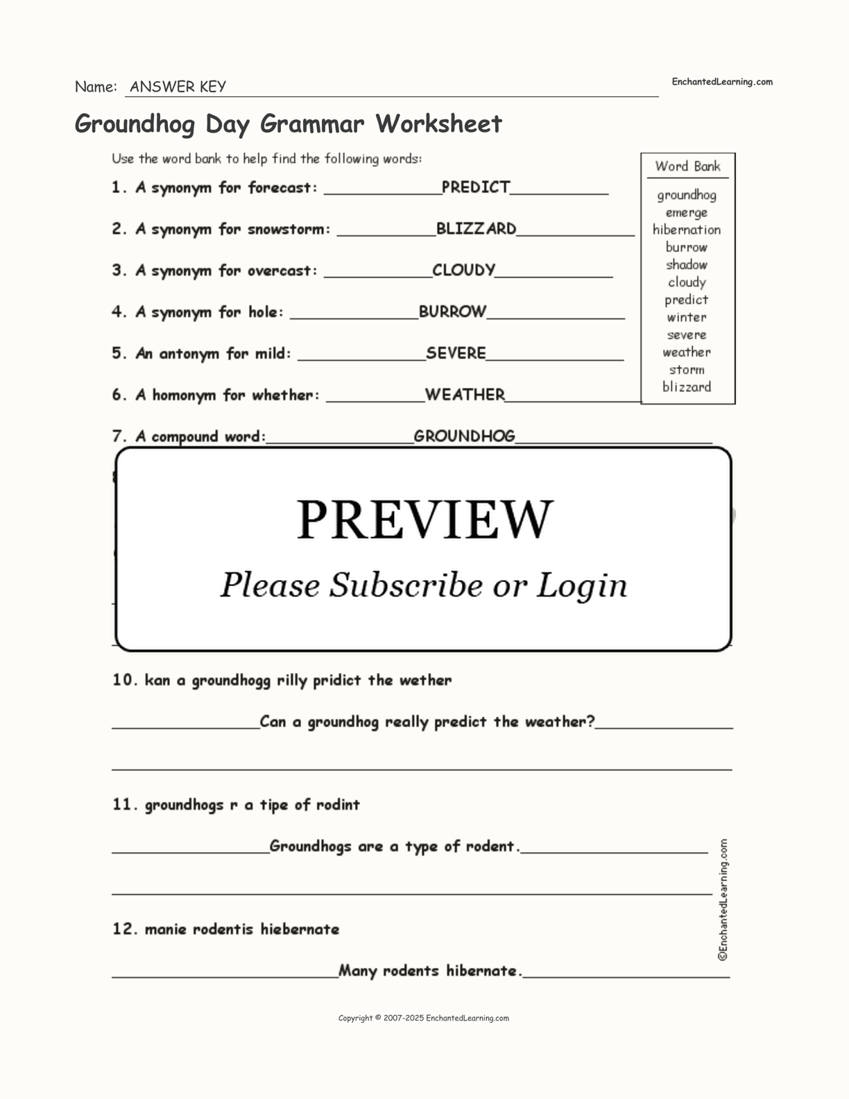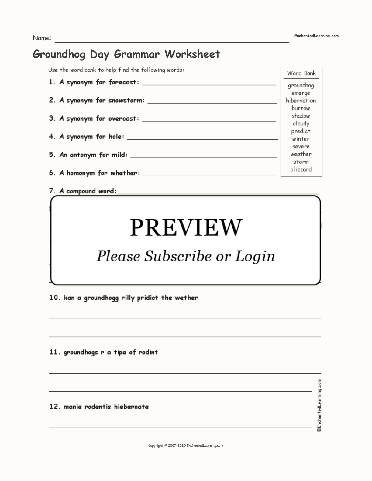 Use the word bank to find Groundhog Day synonyms, antonyms, homonyms, and compound words; then capitalize, punctuate, and correct the spelling of the sentences. This is a printable worksheet.