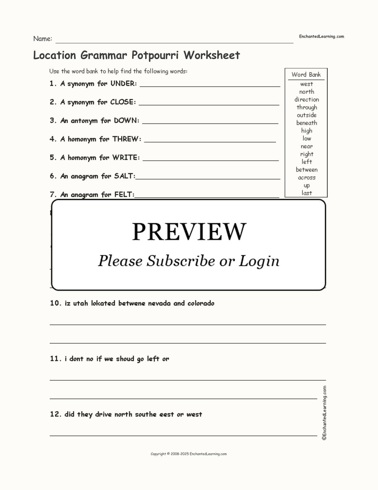 Fill out this grammar potpourri printable worksheet for location-related words. Find synonyms, antonym, homonyms, anagram, and a compound word, then capitalize, punctuate, and correct the spelling of sentences.