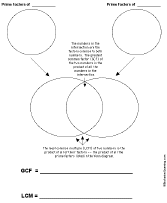 LCM, GCD Factor two numbers into primes, then use a Venn diagram to compute their Least Common Multiple (LCM) and Greatest Common Divisor (GCD). |