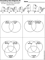 Groundhog Venn Diagram Printout #1 On this printout, the student classifies groundhogs by their shadow direction, the direction they're facing, and whether or not they're in a burrow, by placing them in Venn diagrams. Or go to the answers. |