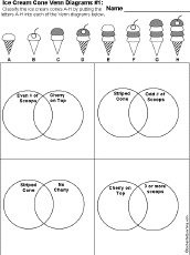 Ice Cream Cone Venn Diagram Printout #1 On this printout, the student classifies ice cream cones by placing them in Venn diagrams. Or go to the answers. |