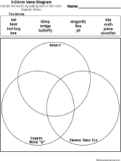Insects/Things-That-Fly/Starts-With-"B" Venn Diagram Printout On this printout, the student classifies insects, things that fly, and words that start with "B" by placing them in a Venn diagram. Words: bat, bear, bed bug, bee, blimp, bridge, butterfly, dragonfly, flea, jet, kite, moth, plane, silverfish. Or go to the answers. |