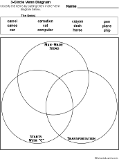 Man-Made/Transportation/Starts With "C" Venn Diagram Printout On this printout, the student classifies man-made items, transportation, and words that start with "C" by placing them in a Venn diagram. Or go to the answers. |
