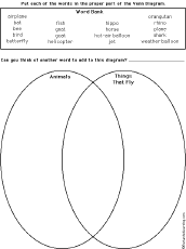 Animals and Flying Things: Venn Diagram Puzzle Put the word bank words in the proper place in the Venn diagram with the headings: animals, things that fly. Or go to the answers. |