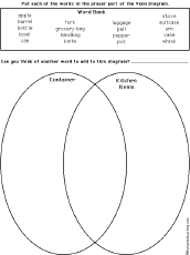 Containers and Kitchen Items: Venn Diagram Puzzle Put the word bank words in the proper place in the Venn diagram with the headings: containers, kitchen items. Or go to the answers. |
