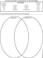 Vacation, Container: Venn Diagram Puzzle Put the word bank words in the proper place in the Venn diagram with the headings: vacation, containers. Or go to the answers. |