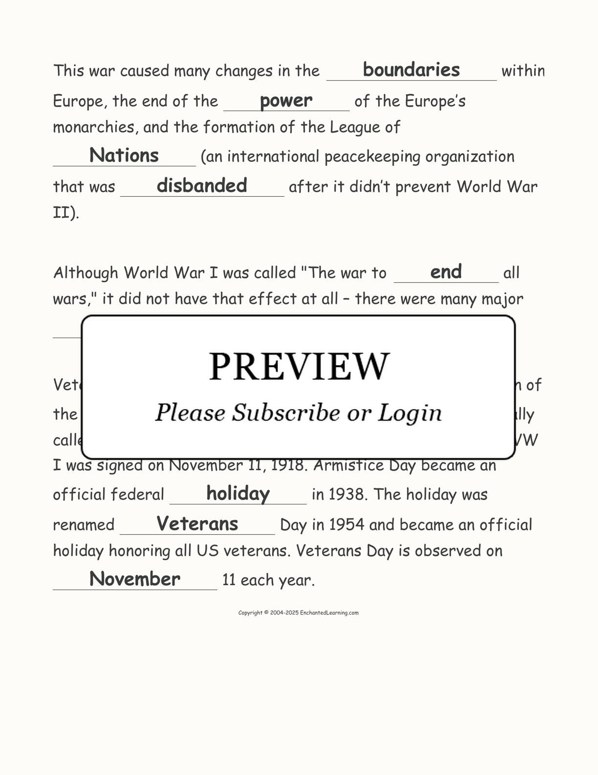Use the word bank to fill in the blanks in this World War I cloze activity. This is a printable worksheet.