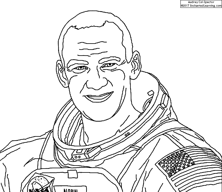 A coloring page of astronaut Buzz Aldrin, the second person to set foot on the Moon.